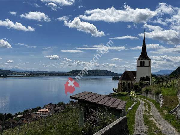 Wunderschöne Kirche oberhalb des Dorfes mit einer herrlichen Aussicht auf den Bielersee mit der St. Petersinsel und den Berner Alpen. im Jahre 1417 wurde die erste kleine Kirche gebaut. Bereits 1482 entstand das grosse Gotteshaus und war viele Jahre eine Wallfahrtskirche. Der Weg zur Kirche heisst immer noch Pilgerweg. Heute ist die Kirche eine belibte Hochzeitskirche.