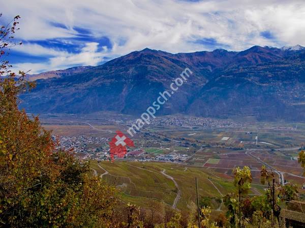 Dorf mit Blick auf das Rhonetal, umgeben von Weinreben, die das ganze Jahr über in de...