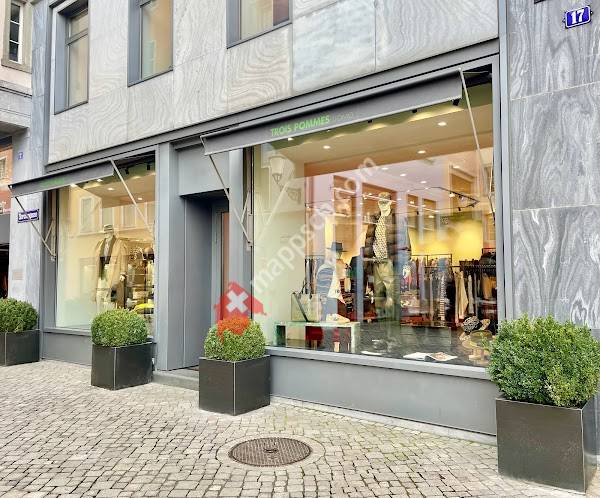 Schlichtes Einkaufszentrum in einem grauen Gebäude mit Supermarkt und einfachem Resta...Fügen Sie diese Karte zu Ihrer Website hinzu;